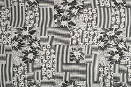 Silk fabric. Black and white squares with floral print. The flowers are black and white. Texture background pattern. From the floral print, the fabric breathes in spring and good mood.