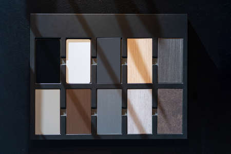 Materials Concept. Top view of wood laminate materials on wooden floor. Interior materials design for home and renovation building. Surface Color Texture of laminate, veneer, parquet, plywood and vinyl floor for Interior designer. Wallpaper for furniture background.