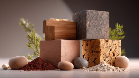 An array of natural materials like stone, wood, and clay arranged aesthetically on a textured background. -