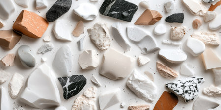 The image showcases various rocks alongside geometric shapes arranged on a pristine white backdrop. The composition features a neutral color palette with natural textures and a minimalist style. The lighting appears soft and diffused, highlighting the objects. Suitable for design, conceptual projects, or advertising materials.