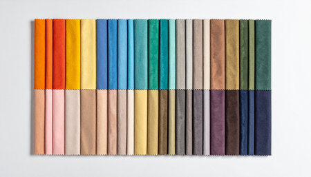 A collection of fabric swatches in diverse textures and colors is arranged on a design board, providing inspiration for interior design projects with copy space available