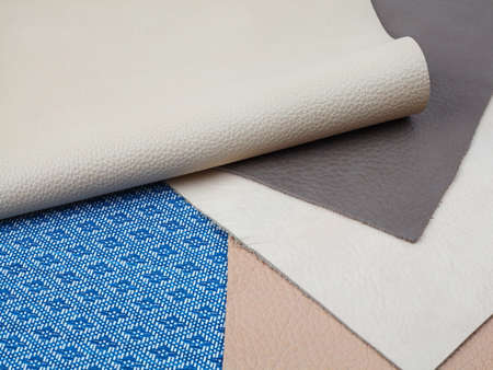 Backgrounds made of natural and artificial fabrics for the decoration of textiles, furniture and clothing on a beige background. Furniture production. wallpaper with space for copying text. Texture