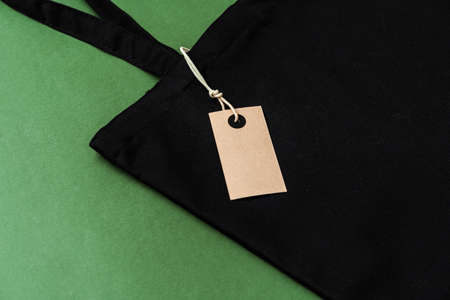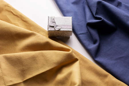 Flat lay eco blue shopping bag on paper yellow color background for tote present reduce mock up stuff shop. Linen canvas textile cloth sale on table top view, care world plastic free reusable concept.