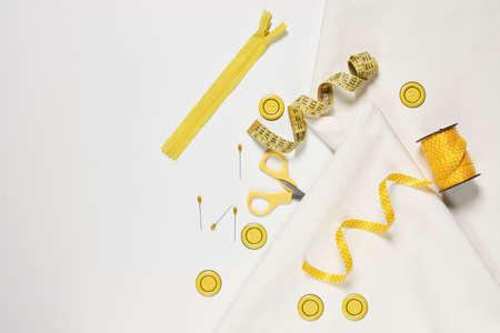 Sewing items from above. Flat lay composition with sewing accessories on light color background. Items for sewing, Sewing clothes, measuring tape, tailoring scissors, threads, buttons and needles