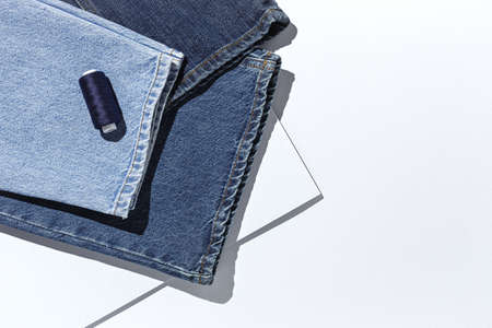 Handicraft, clothing repair. Ripped blue jeans sewing accessories with colorful background from above. Flat lay