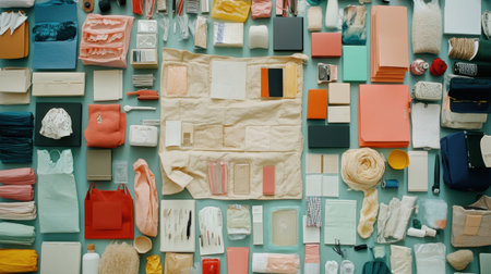Discover an artistic flatlay showcasing a variety of colorful textures and items meticulously arranged on a flat surface, ideal for creative design and inspiration.