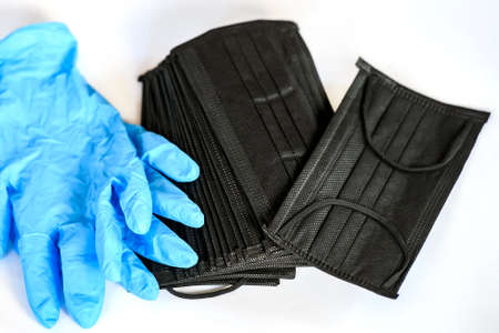 Black medical protective masks with a carbon filter adn blue protective gloves.