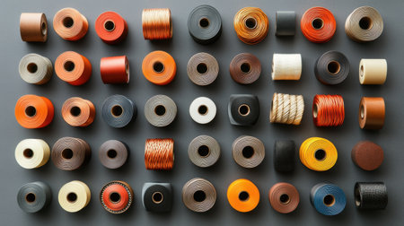 A stunning display of colorful spools of thread in assorted shades, meticulously arranged on a gray backdrop. Perfect for craft projects and artistic inspiration.