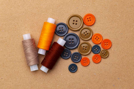Thread spools and buttons on beige background