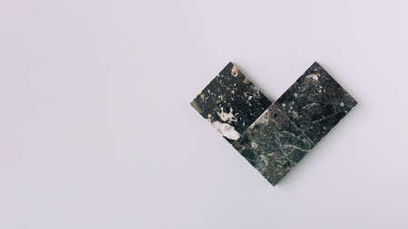 Geometric heart concept. Black terrazzo tiles against grey background. Minimal flat lay love idea.