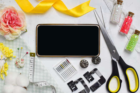 Online sewing courses. Sewing background. Various items for the seamstress. A phone with a copy of the space around it of the sewing equipment. It was flat. Top view.