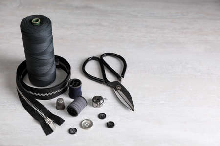 Sewing accesories such as spools of thread, scissors, and buttons.