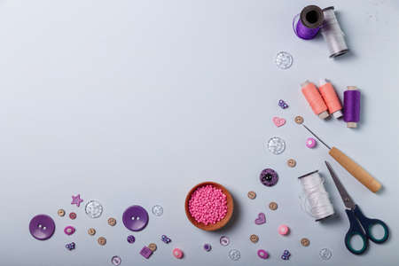 Wooden bowl of pink beads, spools of threads, awl, purple multishaped buttons for sewing and embroidery on white background. Set of materials for handcraft, making of bijouterie and accessories. Top view, copy space.