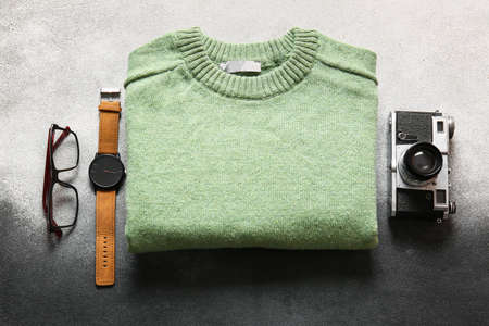 Male sweater, eyeglasses, wristwatch and photo camera on black and white background