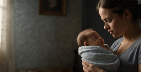 Loving mother gently holds her newborn baby in a warm, intimate home setting. capturing the tender bond and care between parent and child.