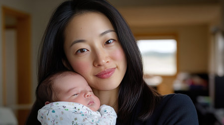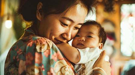 Asian mother holding her sleeping infant in a warm, loving embrace, depicting a quiet moment of maternal bonding and tender affection, representing family and motherhood