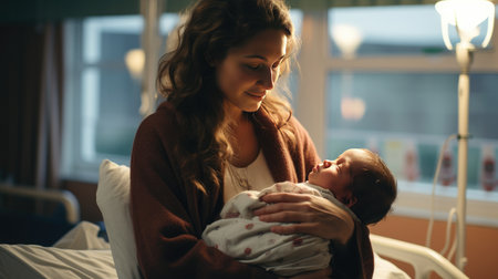 A heartwarming scene capturing a mother holding her newborn baby close in a hospital room. The soft lighting and emotional connection highlight the nurturing bond and joy of new beginnings.