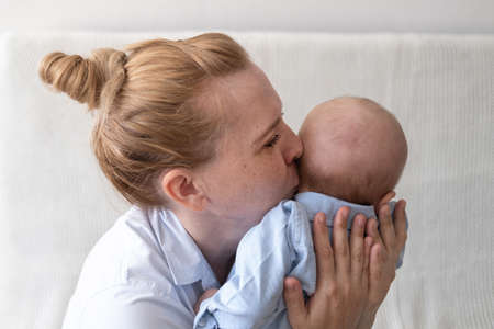 Mother playing with newborn baby son at home. Happy infant and mom. Isolation during quarantine on Mother's day