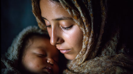 A tender moment captured as Mary gazes lovingly at her sleeping infant, despite the fear and uncertainty surrounding their circumstances