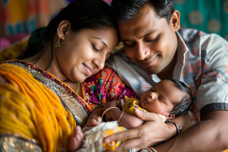 Portrait of a happy Indian family with newborn baby at home.