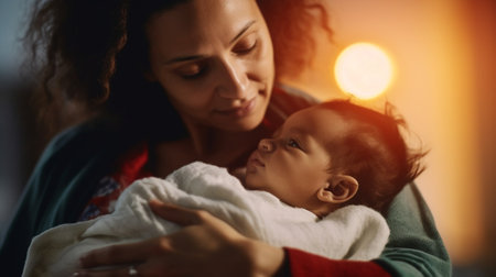 A woman with expressive eyes cradles a baby against her shoulder in a warm and cozy setting. The soft light fills the room, highlighting their bond.