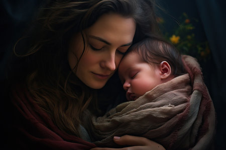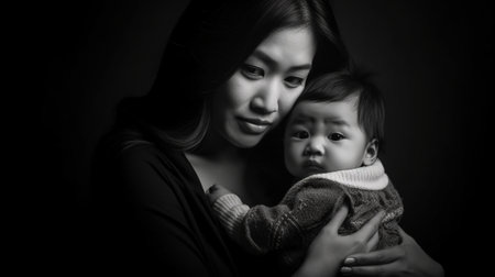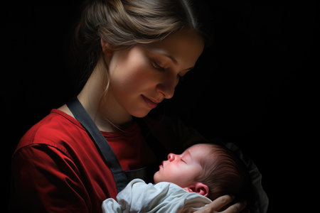 A tender and caring moment of a mother holding a baby on black background