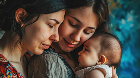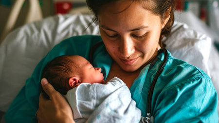 Hispanic female with newborn baby in tender moment of joy in hospital.