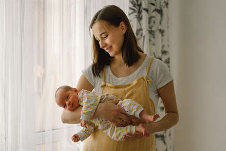 A young mother holds a newborn baby in her arms. Both were in the bedroom, standing by the window with a white curtain as a backdrop.
