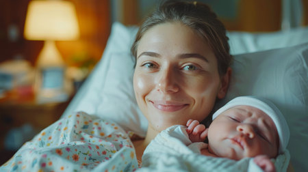 A heartwarming scene capturing a mother gently embracing her newborn baby in a hospital. The soft light enhances their emotional bond, symbolizing love and care.