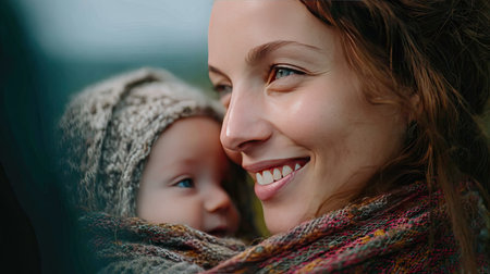 A joyful moment captured between a mother and her baby in a serene outdoor setting. The warmth of their smiles showcases a deep emotional bond, highlighting love and connection in nature's beauty.