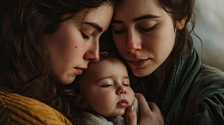 A serene moment capturing a mother holding her sleeping infant close, radiating love and warmth, set against a neutral backdrop that enhances their bond.