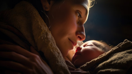 A tender moment captured as a mother gazes at her newborn baby with love and affection, bathed in warm sunlight filtering through a window.
