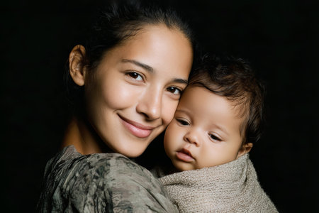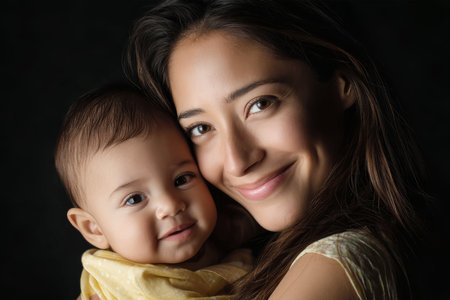A joyful Hispanic mother holds her smiling baby close, radiating love and warmth in a serene studio setting with a dark background.