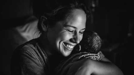 A mother, overwhelmed with emotion, holds her newborn close, their heartbeats syncing in a dance as old as time.