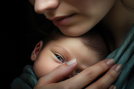 Mother lovingly cradles her newborn in a close embrace, highlighting their emotional connection and serene moment in a dramatic black setting.