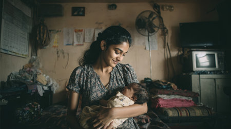 A young mother gently holds her sleeping infant in her arms. The scene is set in a rustic, dimly lit room, highlighting the tender maternal bond.