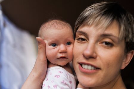 A close-up shot of the happy newborn baby that her happy mother is holding in her hands at home. The smiling infant and the mom in the sunlight in front of the window in the evening.