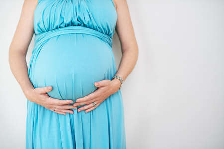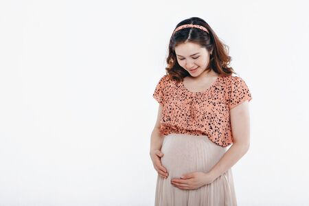 pregnant woman stroking her belly on white background. Copy space. The concept of healthy digestion, lifestyle, IVF
