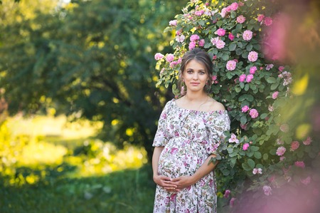 Portrait of a pregnant woman. A beautiful young pregnant woman in a white dress walks in the field.