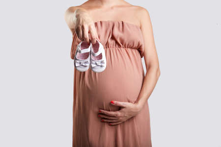 A pregnant woman in a light dress is holding a pair of small children's shoes in front of her. Studio, white background.