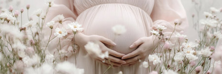 A close up view of a pregnant belly gently cradled by hands, framed by blooming flowers in a peaceful outdoor setting.