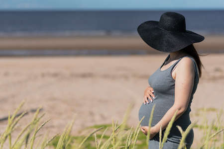 the beach pregnant woman in a gray dress and black hat on holds her hands on her stomach.