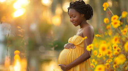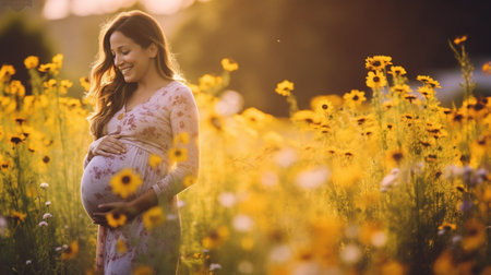Generative AI : beautiful pregnant woman in the summer nature meadow with yellow flowers