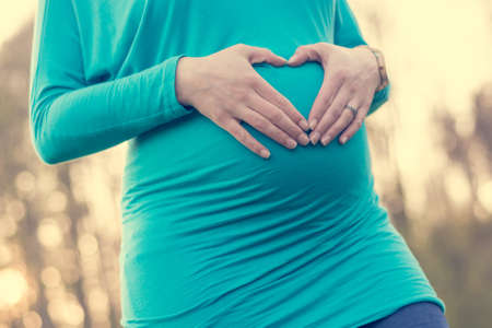 Cropped image of lovely couple do hand sign a heart shape and hugging the tummy. Conceptual of couple expecting a baby with love.
