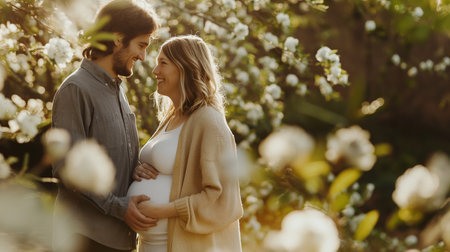 Happy pregnant couple in spring blooming garden. Pregnant woman and her husband