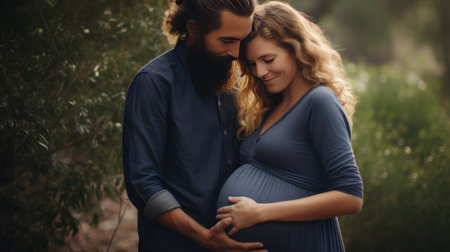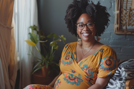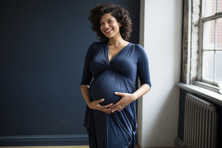 Beaming expectant mother affectionately cradling her growing baby bump with a blissful smile