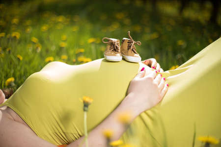 against the background of a flowering field belly of a pregnant woman with baby shoes in hand