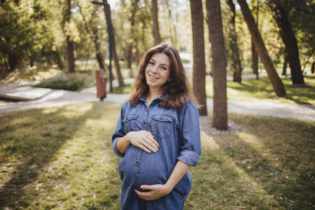 Happy motherhood, healthy pregnancy. Mother and child relation. Young pregnant woman walking in the park breathing fresh air.