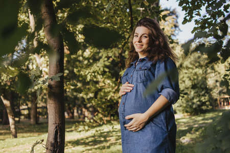 Happy maternity and healthy pregnancy. Young pregnant woman enjoy nature walking in parkland