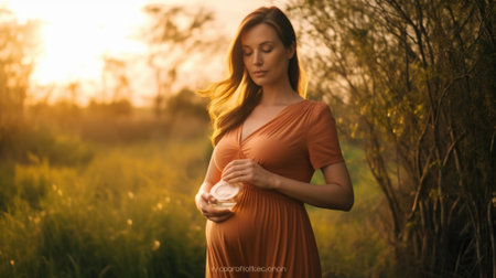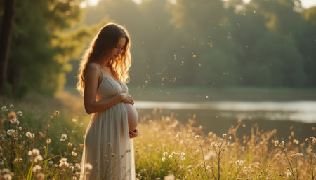 A serene pregnant woman standing by a peaceful lake at sunset, surrounded by nature and soft light. The image evokes calmness, motherhood, and connection with nature.